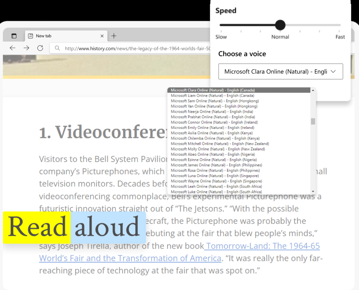 Microsoft Edge 提供非常全面的一组内置网络学习和辅助功能工具,使用沉浸式阅读器可提高阅读理解能力,学生可以使用“大声朗读“功能像收听播客一样收听网页内容。